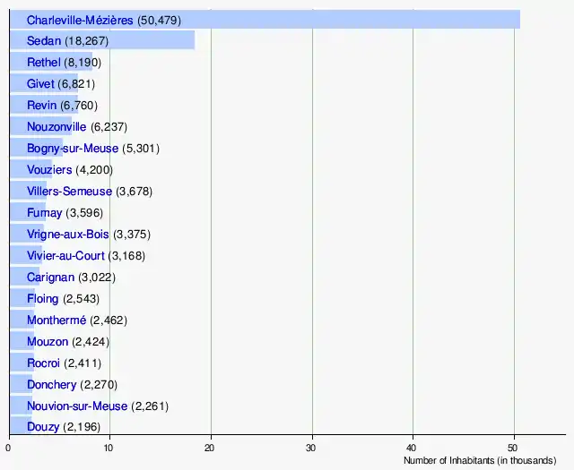 The largest arrondissement of the department is that of Charleville-Mézières while the smallest is Sedan which is half the size. The two arrondissements that occupy the northern part of the Ardennes, however, have four-fifths of the departmental population.