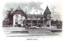 Ardmore's train station is served by SEPTA Regional Rail's Paoli/Thorndale Line (commuter) and Amtrak (intercity) passenger trains. Residents and visitors enjoy several recreation areas, including Linwood Park, as well as South Ardmore Park, which is located in neighboring Wynnewood, though many mistake it for Ardmore. Suburban Square, opened in 1928 as one of the earliest shopping centers in the United States, is located adjacent to the Ardmore train station.[9] Ardmore contains the nation's first suburban branch of a major department store, the former Strawbridge & Clothier which opened there in 1930;[10] the former Suburban movie theater—now Not Your Average Joe's Restaurant; the newly relocated Ardmore Farmer's Market; an Apple Store, and the usual selection of mall shops. Other landmarks within the Ardmore Progressive Civic Association borders include the Ardmore Post Office and Ardmore Public Library (part of the Lower Merion Library System) on South Ardmore Avenue; the Ardmore Ice Skating Club on Greenfield Avenue; a public swimming pool; lighted tennis/basketball courts; the community center known as "The Shack"; and two senior housing projects.[11][12]