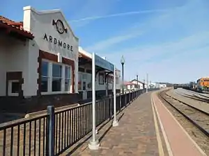![]() The Ardmore station platform in February 2017 with the Atchison, Topeka and Santa Fe Railway station on the left. | ||||||||||||||||||||||||||||