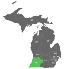 Area code 269 is the telephone area code serving the southwest portion of Michigan's Lower Peninsula.[1] Communities using 269 include Decatur, Dowagiac, Allegan, Battle Creek, Kalamazoo, Buchanan, Paw Paw, Portage, Otsego, Plainwell, St. Joseph, Benton Harbor, Marshall, Niles, Three Rivers, Sturgis, South Haven, Berrien Springs, and Bridgman.