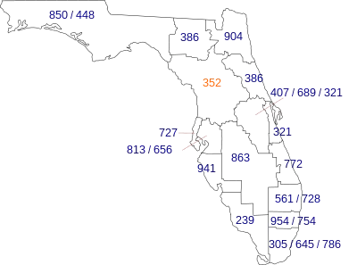 | West: 850, Gulf of Mexico | area code 352 | East: 321/407/689, 386 |