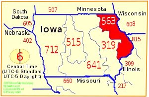 Area code 563 is a telephone area code for the east central and northeast corner of the state of Iowa, and includes most of the Iowa side of the Quad Cities. Area code 563 was split from area code 319 in 2001, becoming active on March 25, 2001, and finally becoming mandatory on December 2, 2001.