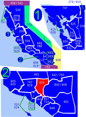 | West: 323, 747/818 | Area code 626 | East: 442/760, 909 |