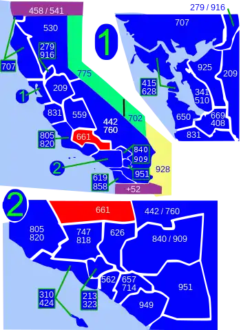 Numbering plan areas in California (blue) and border states. Area code 661 is shown in red.
