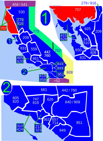 Area code 707 is a telephone area code in the North American Numbering Plan (NANP) for the northwestern part of the U.S. state of California. It was created by a split of area code 415 on March 1, 1959. It serves part of the northern San Francisco Bay Area, as well as the North Coast. Major cities in the area code include Napa, Sebastopol, Vallejo, Benicia, Fairfield, Santa Rosa, Windsor, Healdsburg, Rohnert Park, Petaluma, Fort Bragg, Rio Vista, Crescent City, Eureka, Clearlake, Vacaville, Dixon, and Ukiah.