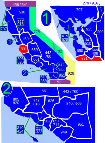 Numbering plan areas in California (blue) and border states. Area code 831 is shown in red.