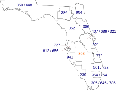 | West: 813, 941 | Area code 863 | East: 561, 772 |