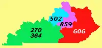 Area code 270 is a telephone area code in the North American Numbering Plan (NANP) for the Commonwealth of Kentucky's western and south central counties. Area code 270 was split from area code 502 on April 19, 1999.[1] Planning for the introduction of a second area code for the region, area code 364, was assigned in 2007. After several years of delay in activation, it was announced in December 2012 that the two area codes would be configured in an overlay plan in August 2013. Mandatory ten-digit dialing began on February 1, 2014. Numbers of the new area code were made available for assignment on March 3, 2014.[2]