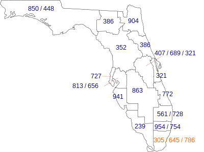 In 1988, the east coast of Florida from Palm Beach County north through Brevard County, as well as the Orlando metropolitan area, was assigned area code 407.[3] In 1995, Broward County was split from 305 and assigned area code 954. Although this was intended to be a long-term solution, within two years the reconfigured area code 305 was already close to exhaustion due to growth in South Florida, and the increasing popularity of cell phones and pagers. In mitigation, area code 786 was installed as an overlay in 1998. The overlay numbering plan area originally comprised only Miami-Dade County; the Keys were added in 2008.[4]
