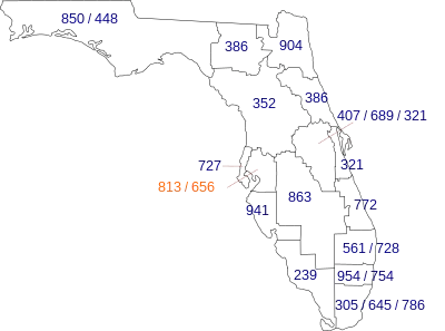 Available numbers for area code 813 are expected to be exhausted during the third quarter of 2022.[4] As a result, the North American Numbering Plan Administrator proposed an "all services overlay", which was approved by the Florida Public Service Commission on March 31, 2020. The new area code 656 is scheduled for initiation of service in mid-to-late February 2022, once all available central office prefixes of 813 have been assigned.[5][6] This requires ten-digit dialing within the numbering plan area, with recorded messages passed on to callers dialling the old method.