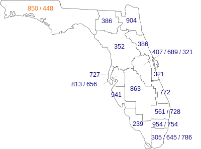 Area codes 850 and 448 are telephone area codes in the North American Numbering Plan for the Florida Panhandle, including Pensacola, Tallahassee and Panama City.[1] Area code 850 was created in 1997 in a split from 904, and area code 448 was assigned as a second code to the same area in an overlay plan in 2019, and mandatory ten-digit local calling began in May 2021.