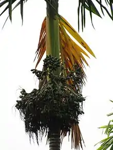 The areca nut tree grows as a single stem, and has generally a height of about 30 metres (98 ft). The fruit, which bears the nut, is orange coloured and is in the shape of an egg or oval shape; it holds a hard single seed.[2]