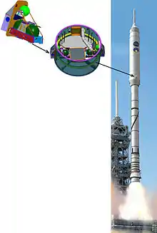 - A forward skirt extension, which housed new, larger parachutes. The three main parachutes each had a 150-foot (46 m) diameter, compared to the Shuttle booster main parachutes, which are 136 feet (41 m) across. It also had a Shuttle booster heritage nosecap that covers the pilot and drogue parachutes. Jettisoning the nosecap released the pilot parachute which pulled out the drogue. The forward skirt extension separated from the booster deploying the main parachutes.