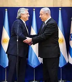 In January 2020, President Alberto Fernández traveled to Israel for his first presidential trip abroad. There he paid respects to the victims of the Holocaust and maintained a bilateral meeting with Prime Minister Benjamin Netanyahu who thanked him for keeping Hezbollah branded as a terrorist organization, a measure taken by former President Mauricio Macri.[18][19]