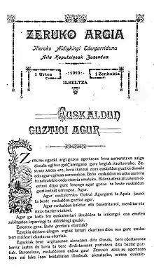 Argia is a weekly newsmagazine published in Basque language, the eldest one still working. Their main office is in Lasarte-Oria, Basque Country. Its name was Zeruko Argia from 1919 to 1921 and from 1963 to 1980, and Argia from 1921 to 1936 and from 1980 to present. It had to cease its activity because of the Spanish Civil War in 1936, and it could not be published again until 1963, when Francoist Spain lifted its ban on Basque-language publications.[1]
