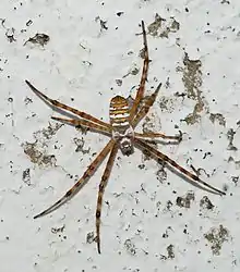 Argiope trifasciata (the banded garden spider or banded orb weaving spider)[2] is a species of spider native to North and South America, but now found around the world.[3] It can be found in certain areas of Europe, namely the Iberian Peninsula, the Canary Islands, and Madeira.[4][2] The similar looking Argiope bruennichi is common in the Azores.[5] They typically begin to appear during autumn from early September to late October as temperatures start dropping.