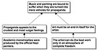 Beardsley said that the conclusion in this example is statement ②. Statement ④ needs to be rewritten as a declarative sentence, e.g. "Academic monstrosities [were] produced by the official Nazi painters." Statement ① points out that the conclusion isn't accepted by everyone, but statement ① is omitted from the diagram because it doesn't support the conclusion. Beardsley said that the logical relation between statement ③ and statement ④ is unclear, but he proposed to diagram statement ④ as supporting statement ③.