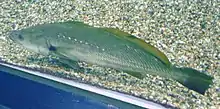 Argyrosomus japonicus is a silvery to bronze-green colored fish, a member of the family Sciaenidae, which may grow up to 2 m (6 ft 7 in) in length.[2][3] It is known as Japanese meagre (FAO),[2] mulloway or jewfish on the east coast of Australia, butterfish in South Australia, kingfish or river kingfish in Western Australia,[4] and dusky/squaretail kob, dusky salmon, salmon or kabeljou in South Africa, Ô-nibe (大鮸, オオニベ) in Japan. The name jewfish refers to its large otoliths, which are prized as "jewels" by some fishers.[3]