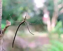 A small thin spider resembling a twig. Often found resting on one or two threads of silk. It eats wandering spiders, mostly juveniles (and some insects). The whip spider waits above the few strands of silk of its snare. When a small wandering spider hits the silk, this causes the whip spider to descend. The whip spider uses the "comb foot" of its end segment of the last pair of legs to wrap the meal in silk.[2]