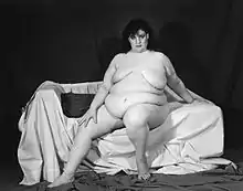 In 1999, she exhibited for the first time in Paris her Aviva series at the Galerie Frank. This series was crucial in Lopez-Huici's search for the transgressive body. Aviva, a beautiful large woman reclined or sat proudly on a bed. Arthur Danto wrote in the exhibition catalogue that "the paraphernalia underscores Aviva's identity as a model, someone who is there to be depicted, and not to represent anything ulterior. The poses too belong to the repertory of studio poses : she is not shown doing anything but pose, which of course goes with her nudity" and further "The photographistic setting is intended as a guarantor of the reality the photographs show : Aviva is the way we see her."[5]