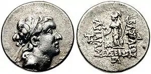 Ariarathes IV was the son of the king of Cappadocia Ariarathes III and his Macedonian Greek wife Stratonice.[1] He was a child at his accession, and reigned for about 57 years.[2] He married his cousin Antiochis, the daughter of Antiochus III the Great, king of Syria, and Laodice III, and, in consequence of this alliance, assisted Antiochus in his war against the Romans. After the defeat of Antiochus by the Romans in 190 BC, Ariarathes sued for peace in 188, which he obtained on favourable terms, as his daughter, Stratonice, was about that time betrothed to Eumenes II, king of Pergamum, whom she later married, and became an ally of the Romans. In 183–179 , he assisted Eumenes in his war against Pharnaces, king of Pontus. Polybius mentions that a Roman embassy was sent to Ariarathes after the death of the Seleucid Antiochus IV Epiphanes, who died 164.