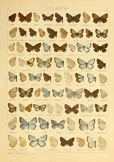 The males dusted with a very bright metallic blue as far as the narrow black margin, with a small but distinct discocellular spot on the forewing. Male resembling astrarche above, the female on both sides, but the underside with more prominent and larger spots, the discal row of ocelli on the forewing more curved. Especially on the Balkan Peninsula, in Asia Minor and Syria. European specimens bear often some small red spots on the upperside of the hindwing before the outer margin; this is ab. pupillata Aign. — crassipunctata Christ. are Armenian specimens with the discocellular spot of the forewing above much enlarged. — Not rare in June and July, in Europe often restricted to the mountains.[2]