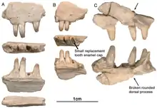 Most maxillary teeth are damaged in some way. Unfortunately, the preserved maxillary tooth rows are too short to determine if heterodonty was present. All the teeth show the typical caseid morphology of having lingually curved crowns, with little or no recurvature. An un-erupted tooth is preserved in the partially resorbed tooth in GAA 00240. As is typical of teeth in their early stages of development, prior to implantation, only the enamel cap is preserved, a simple conical structure. Although difficult to discern, a small secondary cusp is present along the posterior edge of the cap. The tooth immediately anterior to this un-erupted tooth has a similar superficial morphology as those on the premaxilla, with vertical fluting lingually on the enamel surface. Unfortunately, most of the teeth have lost their crown tips, making it difficult to determine if they were also tricuspid. However, the arrangement of the fluting suggests that there also was a central cone in these teeth and possibly two accessory cusps, or at least incipient accessory cusps.[1]