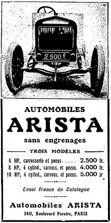 The Arista was a French automobile which took its name from its founder, one P. Arista-Ruffier; the marque was manufactured by the Établissements Ruffier in Paris from 1912 to 1915. Eight models were introduced in the first year of production. These were a 720 cc single cylinder cycle car, fours of 1460cc, 1726 cc, and 1847 cc which featured friction drive and were sold complete with bodywork and tires, and fours of 1460 cc, 1593 cc, 1847 cc, and 2001 cc with conventional gearboxes; these last were sold as untired chassis.