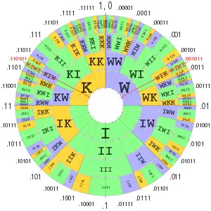 The above example visualised as a circle, the values in red encoding "WIKI" and "KIWI" – in the SVG image, hover over an interval to highlight it and show its statistics