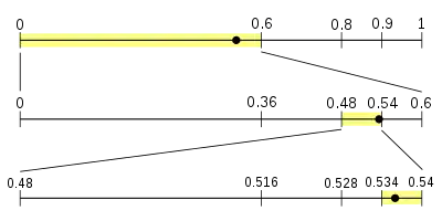 A diagram showing decoding of 0.538 (the round dot) in the example model. The region is divided into subregions proportional to symbol frequencies, then the subregion containing the point is successively subdivided in the same way.