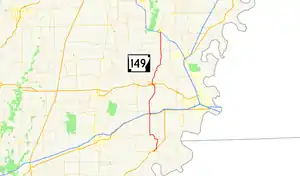 Highway 149 (AR 149, Ark. 149, and Hwy. 149) is a north–south state highway in northeast Arkansas. The route of 41.28 miles (66.43 km) runs from Highway 38 in Hughes north across Interstate 40/US Route 63 (I-40/US 63) to I-555/US 63/US 63 Business (I-555/US 63/US 63B) in Marked Tree.[2]