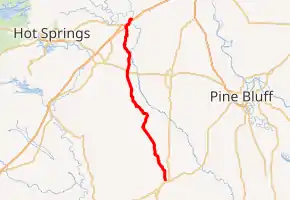 Highway 229 runs north along the western side of Grant County, passing through Leola, where it has a brief concurrency with Highway 46. Northeast of Leola, Jenkins' Ferry Battleground State Park commemorates the Battle of Jenkins' Ferry during the Civil War. The highway runs north to Carvers, where it serves as the eastern terminus of Highway 222. Continuing north to Poyen Highway 229 intersects US 270, which gives access to Malvern to the west and Sheridan and Pine Bluff to the east. Highway 229 winds north through the communities of Fenter, Nydia, Traskwood, and Haskell. An overlap begins with US 67 in Haskell, which continues to I-30 in a discontinuous section of Benton. I-30 and US 67 concur to the north, with Highway 229 through a rural area until terminating at South Drive near the I-30/US 67 southbound frontage road.[6]