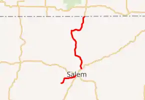 Arkansas Highway 395 (AR 395) is a state highway made up of two sections, both of which are in Fulton County. The southern segment is a 3-mile-long (4.8 km) spur route that begins southwest of Salem and ends at U.S. Route 62 (US 62) / US 412 in Salem. The northern segment begins on the northeastern side of Salem at Highway 9 and travels north and east to the Missouri state line, where it becomes Missouri Route 17.