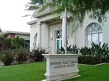 By 1910, the present small downtown of Arlington had developed on Magnolia Avenue.[5] Among the structures still standing from this era are the 1910 Jenkins Building on the corner of Van Buren Boulevard and Magnolia Avenue, which has housed a variety of retail and commercial services, and the 1908-1909 Arlington Branch Library, a classical revival building that was renovated in 1996 and expanded in 2008.[6][7] As recently as 2006, horse stables, while not in use, still stood next to the library building.[8]