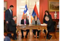 In 2007, the Chilean government recognized the Armenian Genocide.[4] In 2010, Armenia appointed an honorary consul in Santiago.[3] In July 2014, Armenian President Serzh Sargsyan paid an official visit to Chile.[4] During the visit, President Sargsyan met with Chilean President Michelle Bachelet and both leaders discussed a wide range of issues with regard to strengthening the Armenian-Chilean bilateral relations and making joint efforts at promoting cooperation in a number of promising areas. Both leaders signed a Memorandum of Mutual Understanding on Cooperation between both nations Ministry's of Foreign Affairs.[4] In 2016, Chile appointed a resident honorary consul in Yerevan.[3]