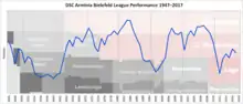 After World War II, a new league with all teams who competed in the Gauliga Westfalen was formed. Arminia were relegated and failed to win re-promotion. In 1947–48, Arminia were a third division side for the first time in their history. After a dominating season in the Bezirksklasse, Arminia was docked 14 points because they fielded an ineligible player.[10] The next season was already under way when the Landesliga (II) was expanded by two teams. Arminia took their chance, won the league and gained promotion to the Oberliga West.[11]