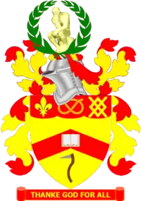Escutcheon: Vert an open book Proper edged and clasped Gold inscribed with the words "ET AUGEBITUR SCIENTIA" between in chief three mullets Argent and in base a rose of the last seeded Proper. |