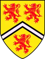 Escutcheon: Argent three piles reversed throughout on a chief Azure a mace Or embellished Argent. |
