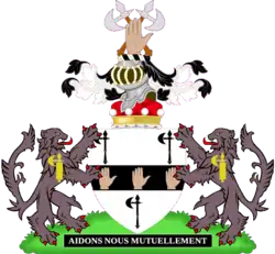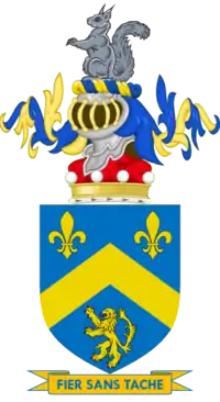 Escutcheon: Azure on a fess between three eagles' heads couped Or a pale between two fleurs-de-lis of the first the pale charged with a fleur-de-lis of the second. |
