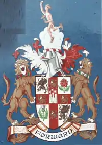 The "ferret and dartboard", a heraldic device registered with both the College of Arms and the Lyon Court. Used from 1956-68. Initially transfers were made of the lion facing both directions, but the College later insisted it must always face left.[3] Issuant from a crown composed of a rose a thistle a leek and an oak leaf Or a demi-lion rampant Gules grasping between the paws a locomotive wheel Argent. |