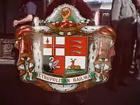 Metropolitan Railway The arms of London - Argent a cross Gules in the first quarter a sword in pale point upwards of the last.[34] |