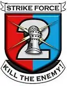 Unit Crest for the 2nd Brigade Combat Team, 2nd Infantry Division. Clearly visible in the image the Armoured Fist, clenching a pair of lightning bolts