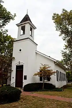 The church was erected in the summer of 1831 under the leadership of Samuel Earhart;[4] its walls, built of brick,[5] were constructed from locally made bricks whose clay originated on Earhart's property.[4] The adjacent cemetery had already been founded; its first burial was Hannah Armstrong, who had died four years before the church's completion in the fall of 1831.[3] Nathanial Armstrong provided that the church be made available for the use of whichever denomination had the greatest number of members in the vicinity. Both at that time and at all times since, the church has been used by Methodists.[2] Relatively few changes have been made to the building since its construction; a tower was added in 1890, but only minor repairs have been carried out otherwise. Although the foundation was built of fieldstones and held together by soil rather than mortar, it has moved only slightly; a restoration performed in the 1970s demonstrated that the building had settled just 2 inches (51 mm) in 140 years.[6]