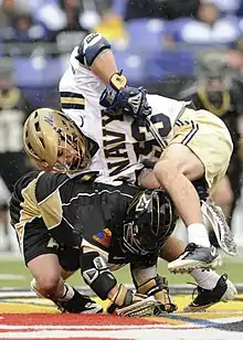 The Army–Navy lacrosse rivalry is an intercollegiate lacrosse rivalry between the Army Black Knights and the Navy Midshipmen. The two programs, historical rivals in other sports like football and soccer, have a fierce and nationally-relevant rivalry in lacrosse as well. With 25 national championships, 10 Final Fours in the NCAA era, and 190 consensus first team All-Americans, the two teams have been integral to the game's history.[1][2] The rivalry carries a different spirit than many others in collegiate lacrosse, described by former Navy goalie Ryan Kern as: "t’s the same camaraderie that you had in the fall with the football game and it kind of comes out again in the spring with the lacrosse game,” Navy junior goalie Ryan Kern said. “No doubt, all the other sports are important, but just the sheer number of people that come to this game is crazy — just like the football game. You see 16,000 people come to a regular season lacrosse game, and that’s not happening at other lacrosse programs."[3] After 101 meetings, Navy leads the series 62–36–3 through 2021.[1]