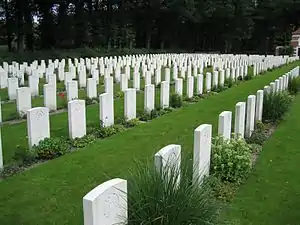 Five men were awarded the Victoria Cross after the battle, four of them posthumously. Three of the men now rest in the cemetery;[13] Lieutenant John Hollington Grayburn of the 2nd Battalion, Parachute Regiment; Flight Lieutenant David Samuel Anthony Lord of 271 Squadron, Royal Air Force and Captain Lionel Ernest Queripel of the 10th Battalion, Parachute Regiment. Lance-Sergeant John Daniel Baskeyfield of the 2nd Battalion South Staffordshire Regiment has no known grave and is commemorated instead at Groesbeek Memorial. Major Robert Henry Cain, also of 2nd Battalion, South Staffordshire Regiment, survived the battle and was buried on the Isle of Man when he died in 1974.[19]