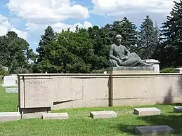 In the summer of 1925, Rönnebeck traveled to Taos, New Mexico to visit his friend Mabel Dodge Luhan at her artists' enclave.[2] The visit had several important consequences including exposing Rönnebeck to the desert landscape and the Indigenous peoples of New Mexico, which subsequently became recurrent themes in Rönnebeck’s work, and, Rönnebeck's introduction to Louise Emerson (1901–1980). Emerson was a painter from Philadelphia who had studied with Kenneth Hayes Miller. Rönnebeck and Emerson were married in March 1926 in New York.[12] He would return to Santa Fe frequently between 1927 and 1929, working with architect John Gaw Meem to complete the relief sculptures for the renovation of the La Fonda Hotel. His series of terra cotta panels were inspired by the ceremonial dances of the Pueblo Indians, including Buffalo, Eagle, Deer, Corn, Shalako and Peace Dances.[13] He worked with Meem a second time, in 1936, this time producing three aluminum relief panels depicting Pueblo and Hopi Indian Kachina masks, in the auditorium of the Colorado Springs Fine Arts Center.