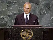 Arnold Rüütel OIH (Estonian pronunciation: [ˈɑrnold ˈryːtel]) (born 10 May 1928)[1] is an Estonian politician and agricultural scientist. He has served as the last chairman of the Presidium of the Supreme Soviet of the Estonian SSR from April 8, 1983, to March 29, 1990, Chairman of the Supreme Soviet of the Estonian SSR (from May 8, 1990: Supreme Council of the Republic of Estonia) from March 29, 1990, to October 6, 1992, and was the third president of Estonia from October 8, 2001, to October 9, 2006. He was the second president since Estonia regained independence in 1991. Rüütel also served as one of fifteen Deputy Chairmen of the Supreme Soviet of the USSR.