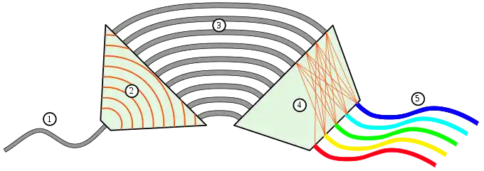 Conventional silica-based AWGs schematically shown in the above figure, are planar lightwave circuits fabricated by depositing doped and undoped layers of silica on a silicon substrate. The AWGs consist of a number of input (1) / output (5) couplers, a free space propagation region (2) and (4) and the grating waveguides (3). The grating consists of many waveguides with a constant length increment (ΔL). Light is coupled into the device via an optical fiber (1) connected to the input port. Light diffracting out of the input waveguide at the coupler/slab interface propagates through the free-space region (2) and illuminates the grating with a Gaussian distribution. Each wavelength of light coupled to the grating waveguides (3) undergoes a constant change of phase attributed to the constant length increment in grating waveguides. Light diffracted from each waveguide of the grating interferes constructively and gets refocused at the output waveguides (5), with the spatial position, the output channels, being wavelength dependent on the array phase shift.