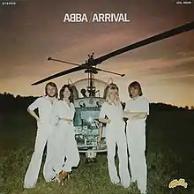 The final track to be recorded was an instrumental piece entitled "Ode to Dalecarlia". Featuring Andersson prominently on keyboards, the track was renamed "Arrival" – a word that had already been decided as the title of their new album. By September 1976 work on the album was finished just as "Dancing Queen" was topping the charts all over the world. The album cover shots were taken of the group posing in and out of a Bell 47 helicopter at the Barkarby Airport, northwest of Stockholm.[3] The now-renowned "mirrored-B" copyrighted ABBA logo, an ambigram designed by Rune Söderqvist in 1976, was also premiered on the album cover. Arrival was released on 11 October 1976.
