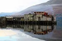 The photograph shows the former torpedo testing facility at the head of Loch Long.[3] It was decommissioned in 1980 and is currently part demolished. Demolition has been stalled since a fire on the site in June 2007.